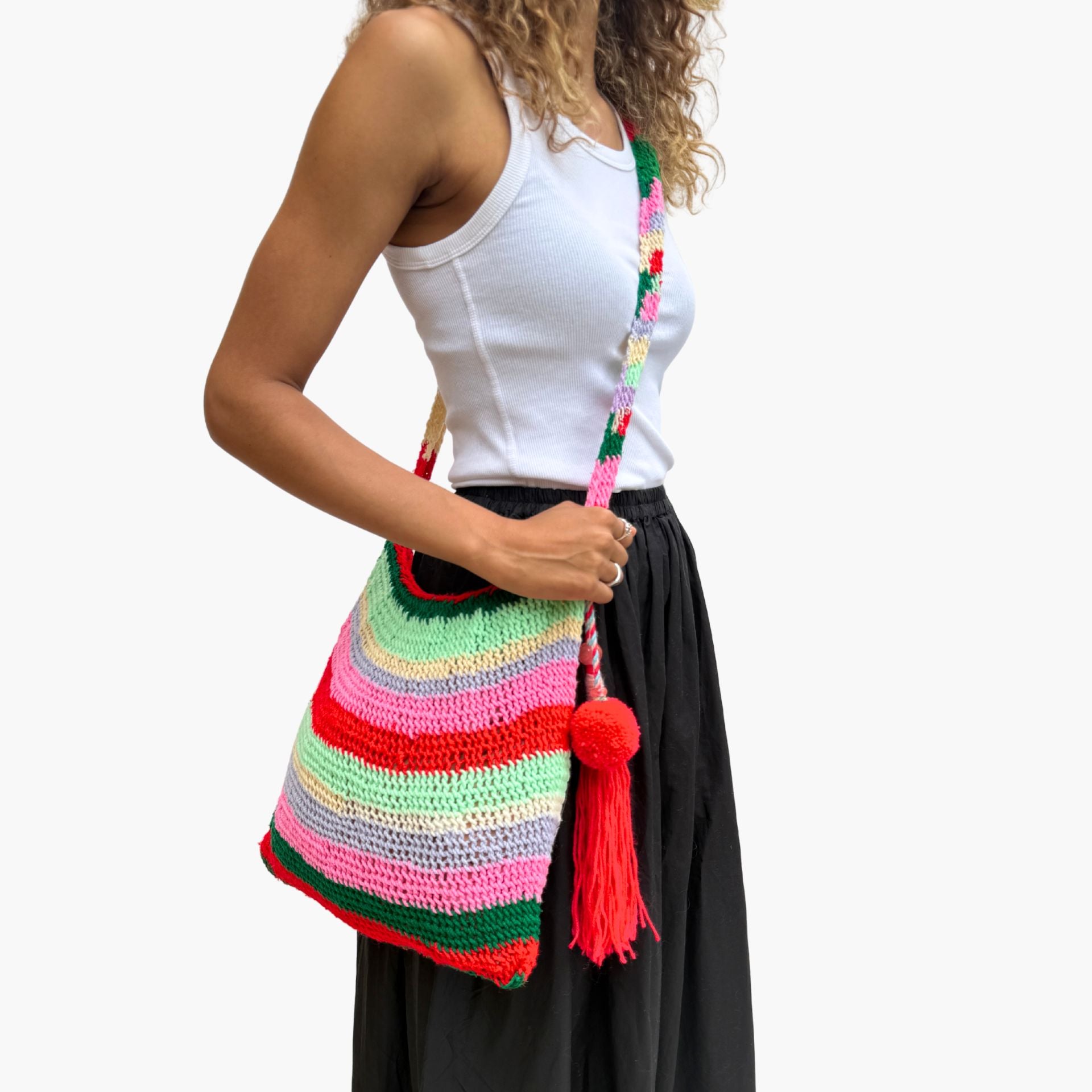 Much like the joyful colour palettes she chooses, Tama has the most wonderful spirit and energy. She lives near Goroka with her 14-year-old son, and from the income she makes through Bilum Tama is able to send him to school and provide essentials for her family.