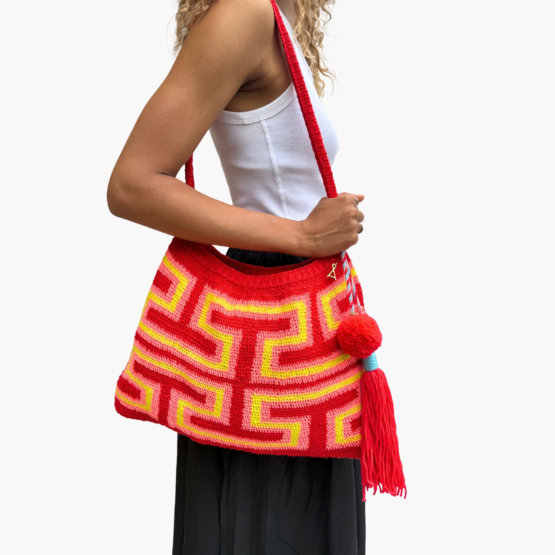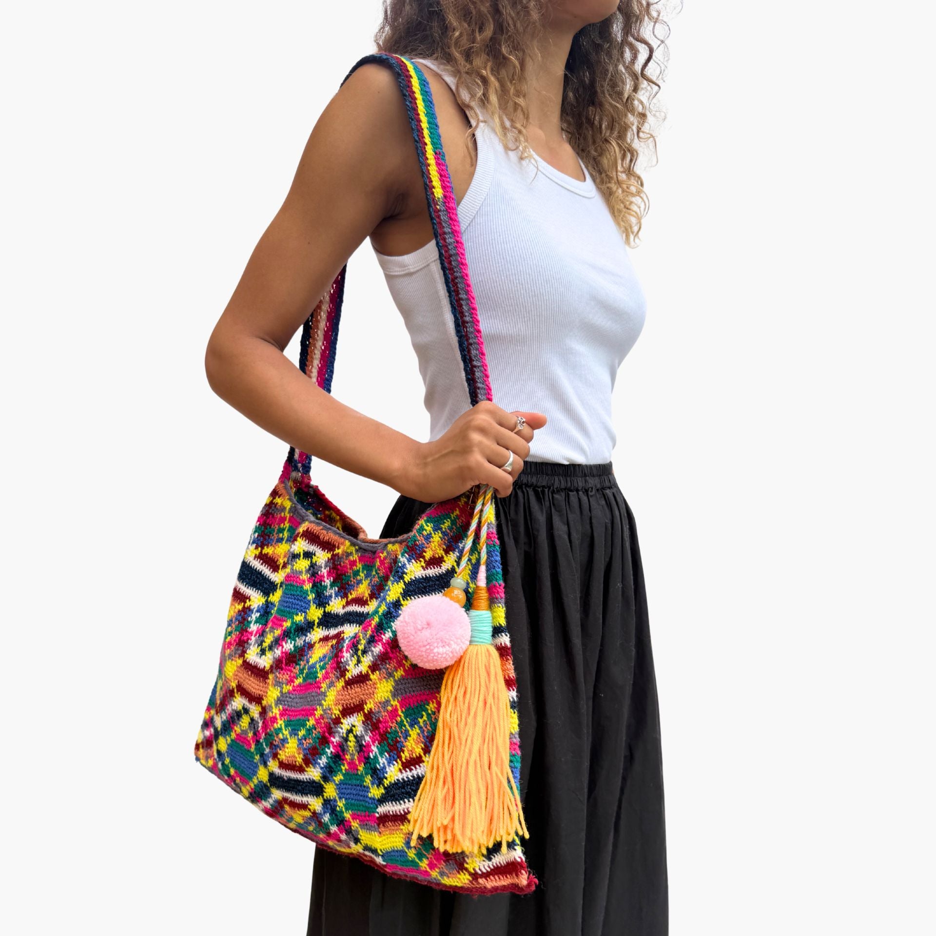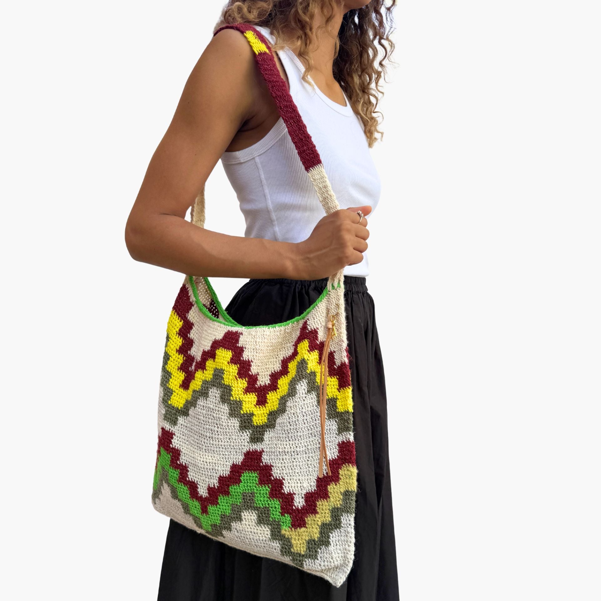 Much like the joyful colour palettes she chooses, Tama has the most wonderful spirit and energy. She lives near Goroka with her 14-year-old son, and from the income she makes through Bilum Tama is able to send him to school and provide essentials for her family.